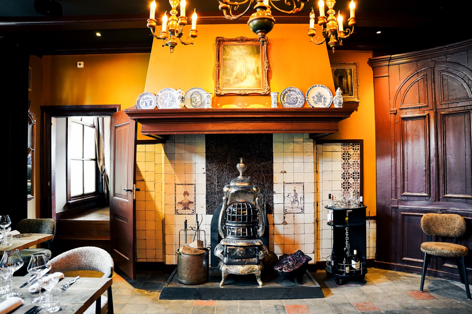 De oude keuken is onderdeel geworden van ons restaurant en ligt tegen de Gelagkamer aan! Hier staat ook het oude, hout gestookte fornuis met tegelplateau. Dit is één van de vele verloren schatten uit het ‘Oude Huis Leuvenum’.